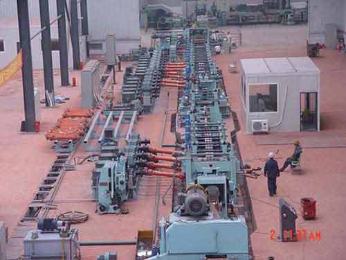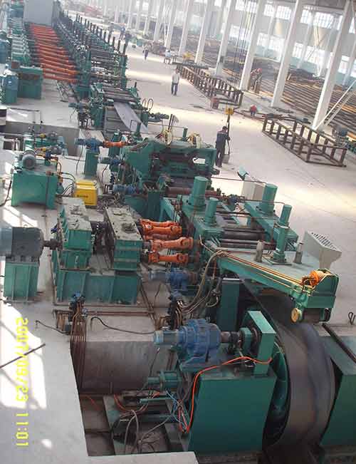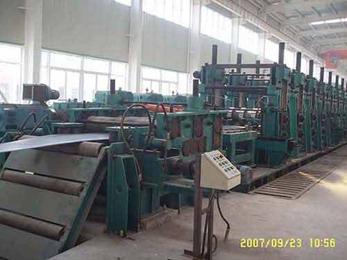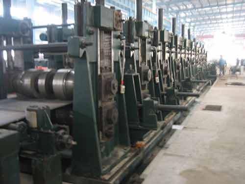 上卷—开卷—矫平—剪切对焊—活套储料—精矫平—成型—高频焊接—稳定拉料—水冷—定径—飞锯定尺切断—方管自动码垛—打包—成品收集。