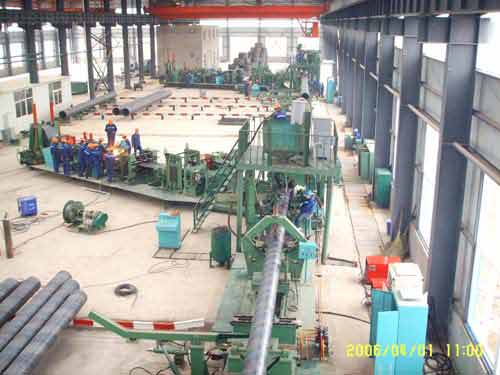上卷—开卷—矫平—剪切对焊—铣边机—递送机—预弯及导板—成型—内焊—外焊—跟踪切断—拔出—内、外焊缝修磨—管端扩径—X光检测—水压试验—平头倒棱—超声波检测—管端拍片—称重测长喷标—成品收集。