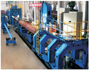 RBE机组的生产工艺:钢板超声波探伤机→钢板铣边机→RB制管成型机→后预弯机→预焊装置→钢管内焊装置→钢管外焊装置→焊缝超声波探伤机→钢管焊缝(X射线)探伤机→钢管全管体扩径机→钢管水压试验机→钢管压力矫直机→钢管整圆机→钢管管端内外焊缝修平机→钢管平头倒棱机→钢管超声波相控阵检测装置→钢管焊缝X射线检测装置→管端X光拍片→称重测长→钢管内、外壁喷标记→出厂。