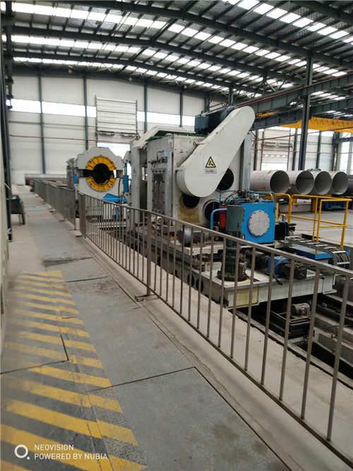 RBE机组的生产工艺:钢板超声波探伤机→钢板铣边机→RB制管成型机→后预弯机→预焊装置→钢管内焊装置→钢管外焊装置→焊缝超声波探伤机→钢管焊缝(X射线)探伤机→钢管全管体扩径机→钢管水压试验机→钢管压力矫直机→钢管整圆机→钢管管端内外焊缝修平机→钢管平头倒棱机→钢管超声波相控阵检测装置→钢管焊缝X射线检测装置→管端X光拍片→称重测长→钢管内、外壁喷标记→出厂。