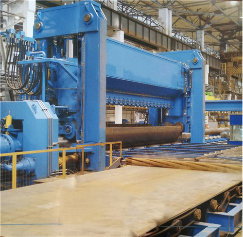 JCOE机组的生产工艺:钢板超声波探伤机→钢板铣边机→前预弯机→JCO制管成型机→预焊装置→钢管内焊装置→钢管外焊装置→焊缝超声波探伤机→钢管焊缝(X射线)探伤机→钢管全管体扩径机→钢管水压试验机→钢管压力矫直机→钢管整圆机→钢管管端内外焊缝修平机→钢管平头倒棱机→钢管超声波相控阵检测装置→钢管焊缝X射线检测装置→管端X光拍片→称重测长→钢管内、外壁喷标记→出厂。