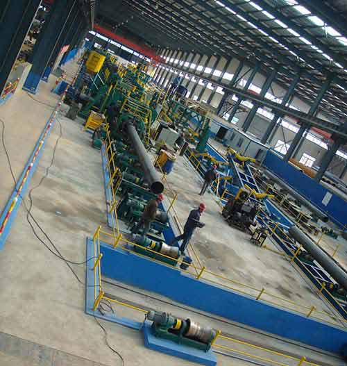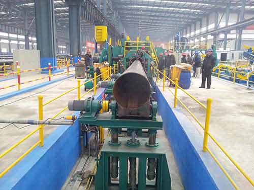 控制柔性成型,利用轧辊将钢板弯曲成圆管抷,用气体保护焊将钢管预焊接,然后切断,离线对钢管内、外焊缝进行埋弧焊接,再经过水压试验、平头倒棱、焊缝及管体检测后得到合格的埋弧焊管。该机组定径部分采用快速换辊技术,大大节省换规格时间。